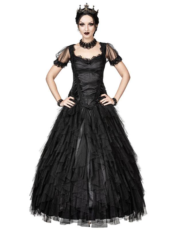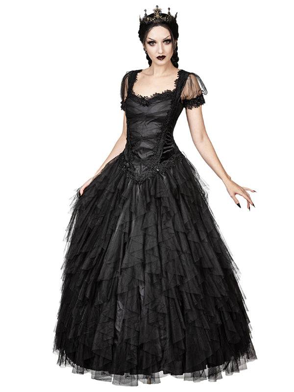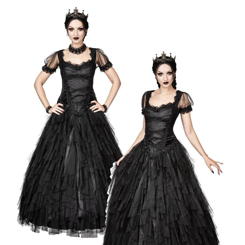 Robe longue victorienne romantique avec un décolleté en cœur et des manches bouffantes élastiquées en maille. Devant en satin et dentelle. Des nœuds en ruban de satin noir décorés de boutons de roses ornent le haut et les manches. La jupe légère et fluide de la robe se compose de deux épaisseurs : la partie supérieure de la jupe est faite de maille noire douce avec plusieurs niveaux de dentelle noire pour donner du volume. La jupe est entièrement doublée de satin doux et soyeux noir. Fermeture éclair dissimulée au dos.