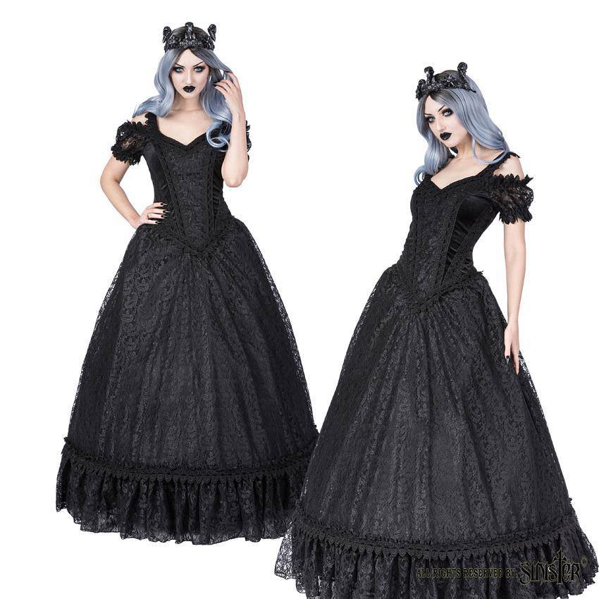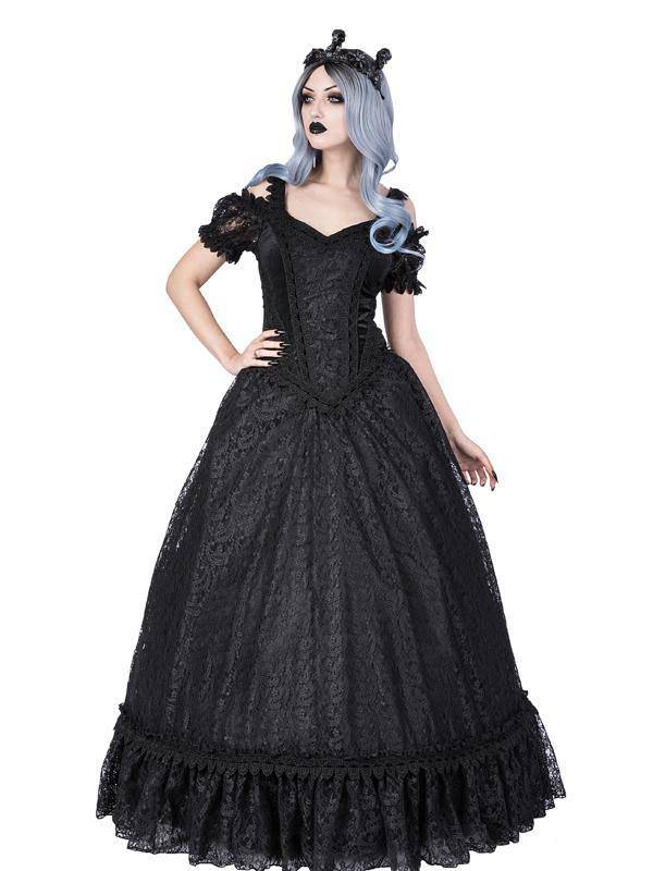 Robe longue en dentelle avec manches bouffantes. Les panneaux en velours et satin à l'avant et au dos du corsage sont recouverts de dentelle noire et sont ornés d'une bordure en dentelle de brocart avec un ruban de velours. Le premier élément de la jupe est en dentelle. Le bas est constitué de dentelle à volants ornée d'une bordure de dentelle de brocart décoré d'un ruban de velours. La jupe du milieu est faite d'un tulle rigide pour créer un volume naturel. La jupe est entièrement doublée de satin doux et soyeux. Fermeture éclair dissimulée au centre du dos.