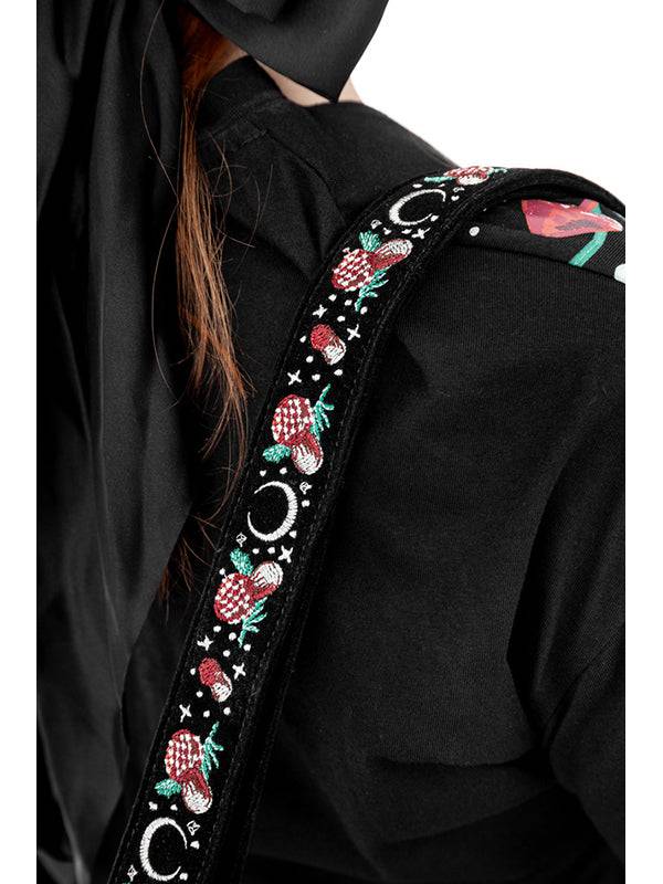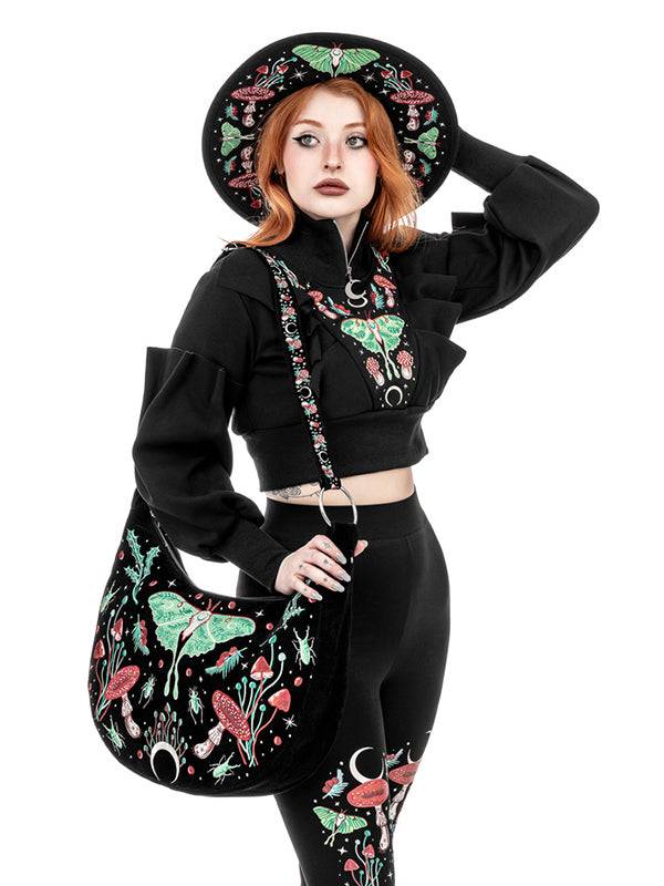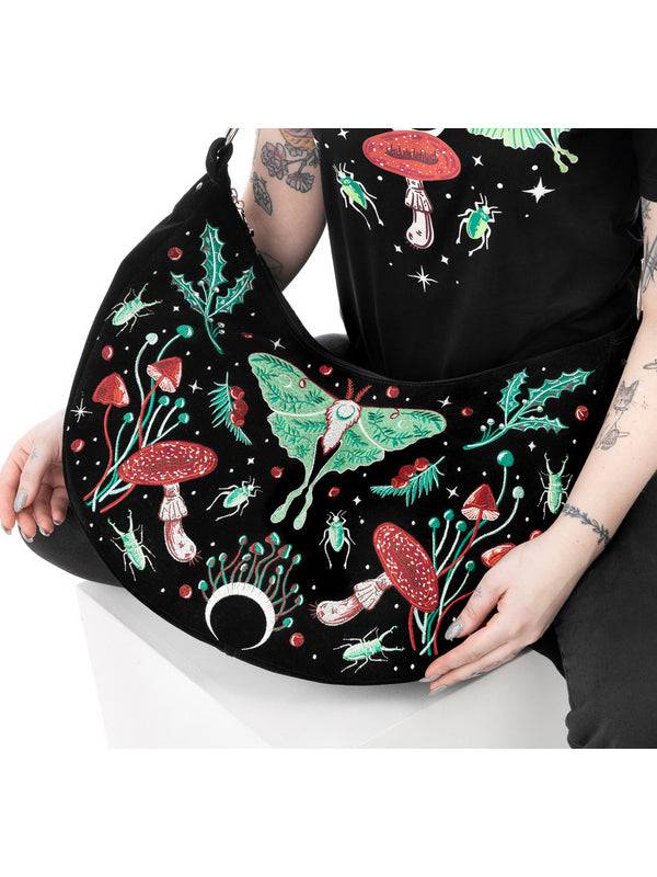 Tas gemaakt van luxe zwart fluweel met borduurwerk met Luna Moth, paddenstoelen, paddo's, kevers, bosplanten en fonkelende sterren op tas en riem. Hoofdvak met ritssluiting voor veiligheid. Klein achterzakje met ritssluiting. Zilveren maantrekkers. De binnenkant is voorzien van twee praktische vakken: een vak met ritssluiting en een steekvak.
