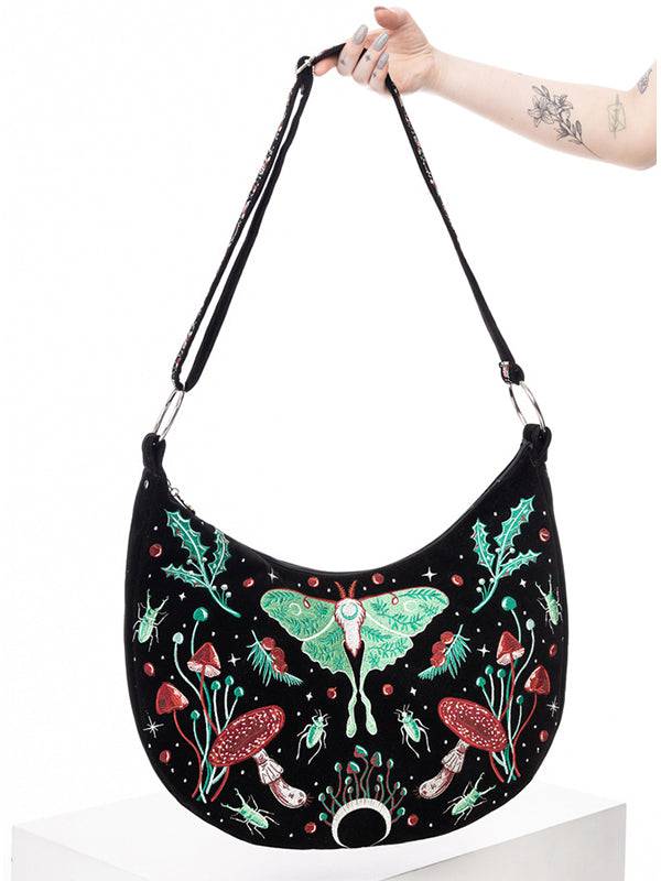 Luxurious Black Velvet Bag with Luna Moth and Nature Embroidery - Stylish Zippered Design