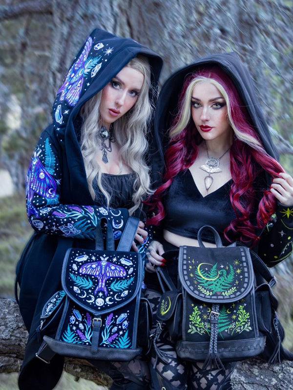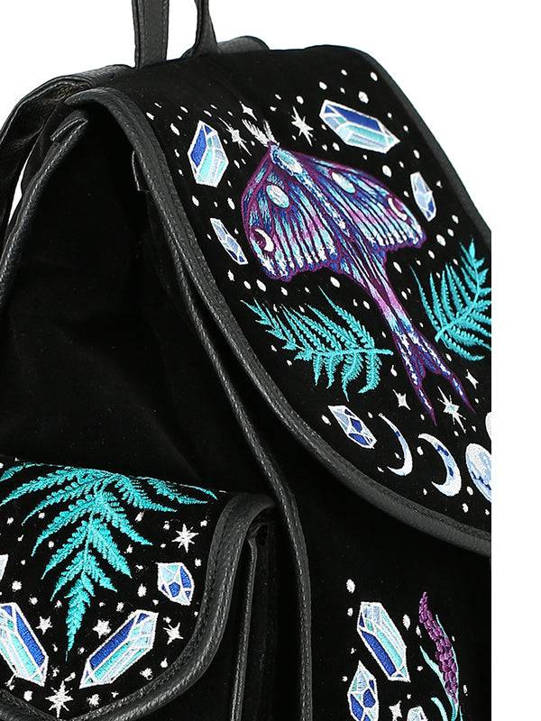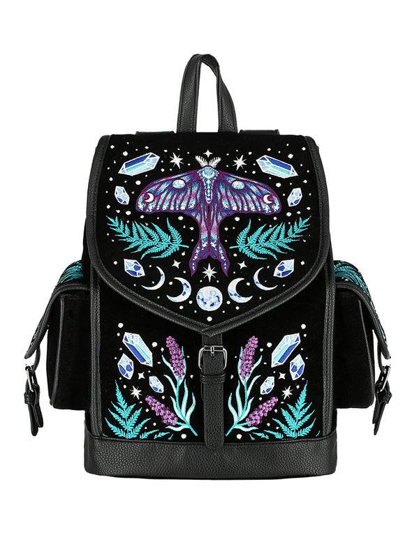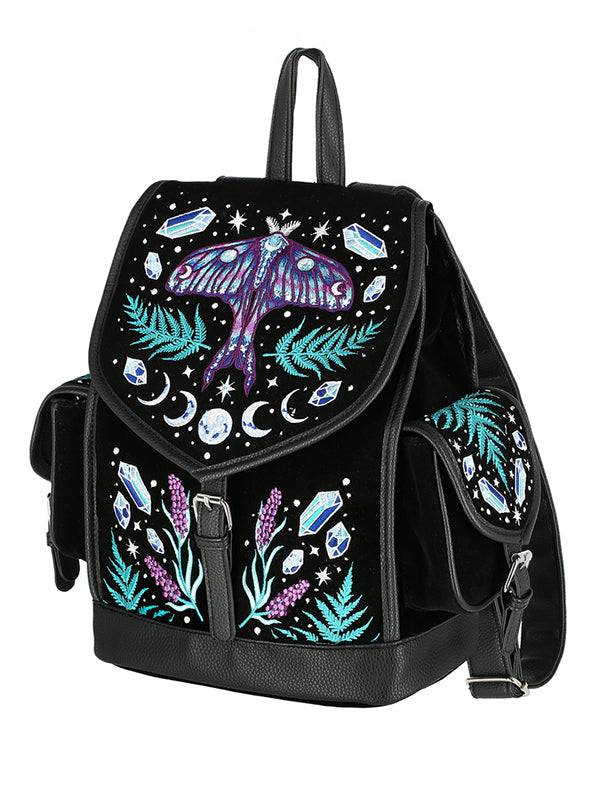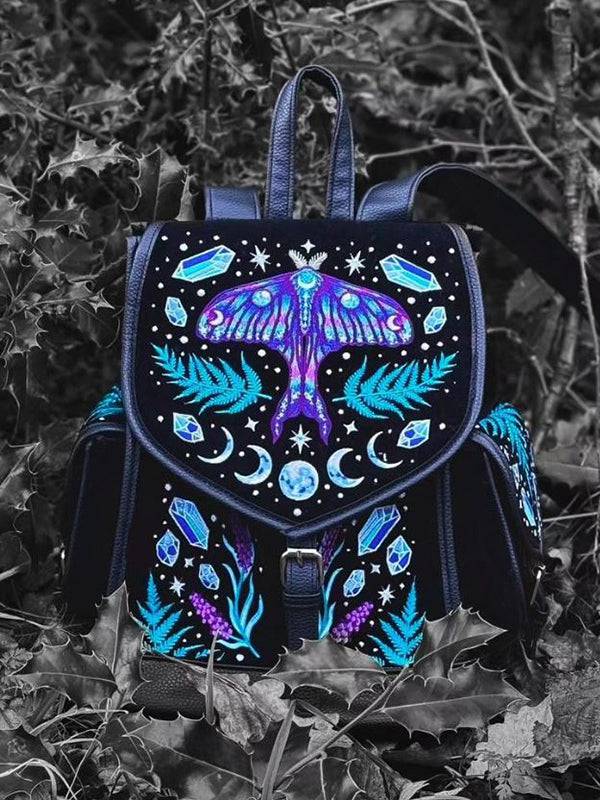 Enchanted Forest Backpack with Intricate Embroidery of Ethereal Moths, Moon Phases and Stars