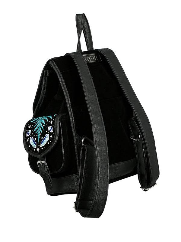 Rugzak met gedetailleerd borduurwerk met een etherische mot, zwevend in de lucht tegen een betoverende zwarte achtergrond. Dit hemelse wezen wordt omringd door de glinsterende dans van maanfasen, de glinstering van sterren en de fonkeling van kristallen. De aanwezigheid van varenbladeren en lavendelbloemen roept de essentie op van een geheimzinnig, betoverd bos. Met een ritsvak en een steekvak aan de binnenkant, evenals twee kleinere vakken aan de zijkanten. Het hoofdvak heeft een ritssluiting en is beveiligd met magnetische sluitingen en gespen. De schouderbanden zijn verstelbaar.