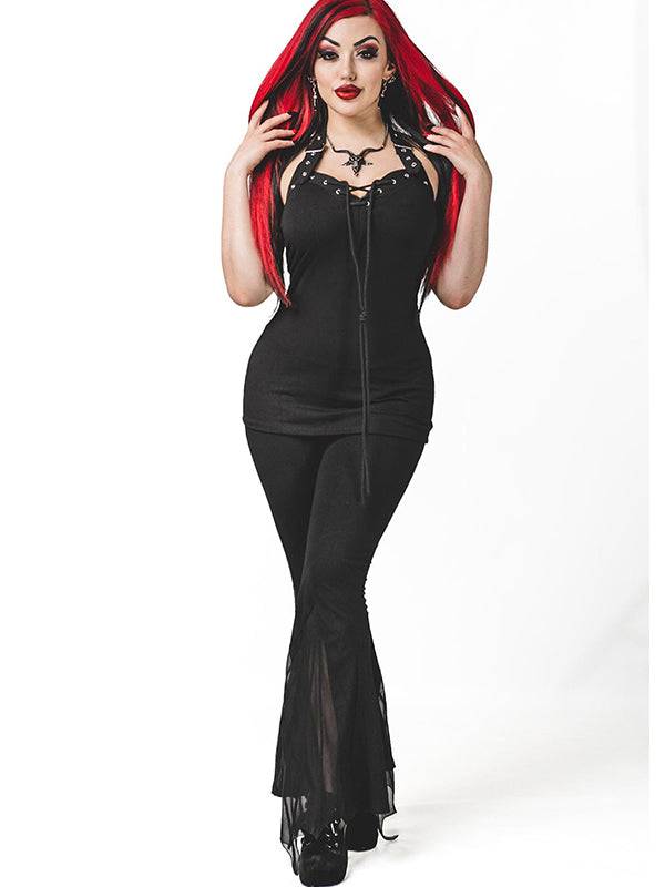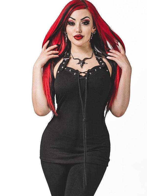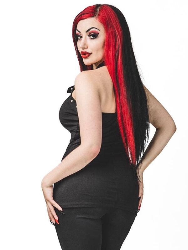 Zwarte gothic haltertop met verstelbare bandjes. Gemaakt van 95% katoen en 5% elastaan.