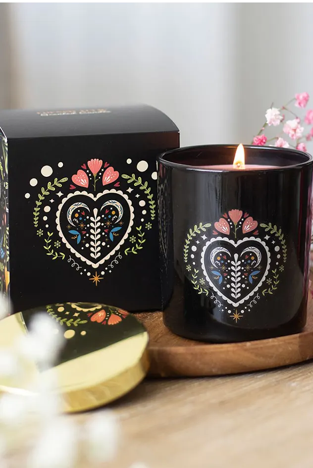 Unwind in style with this elegant French Tulip scented candle housed in a sleek black glass jar featuring a striking folk heart design. Ideal for creating a cosy, floral-scented space or gifting to someone who enjoys luxe home fragrance. Approximately 28-hour burn time. Made from paraffin wax. Never leave a lit candle unattended.