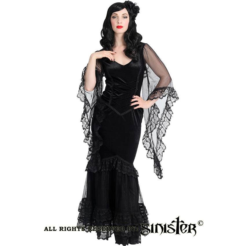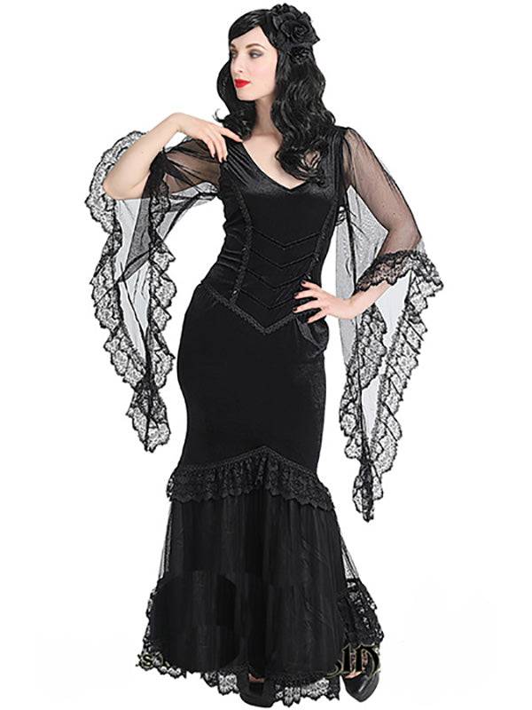 Morticia Black Velvet Dress with Mesh Sleeves - Elegant Stretch Design by Sinister Clothing