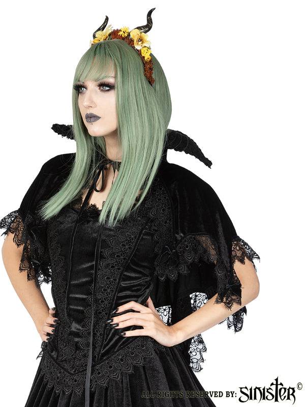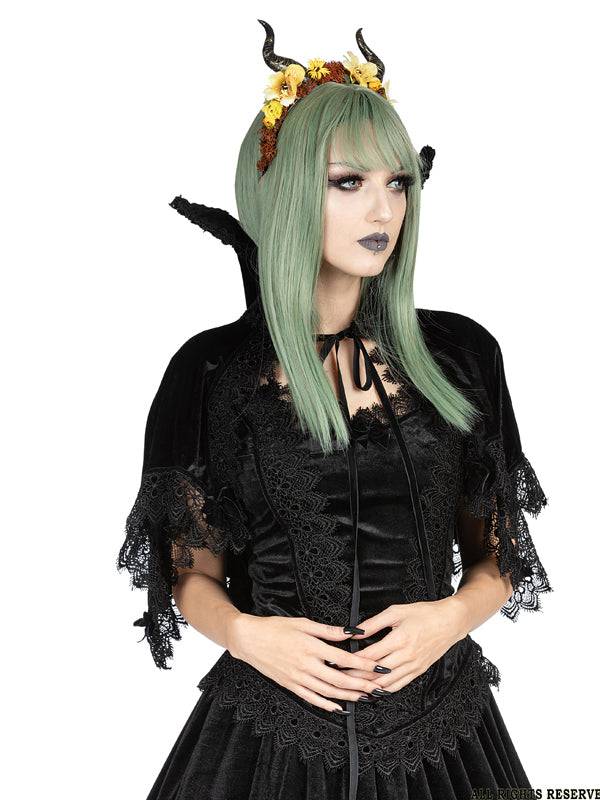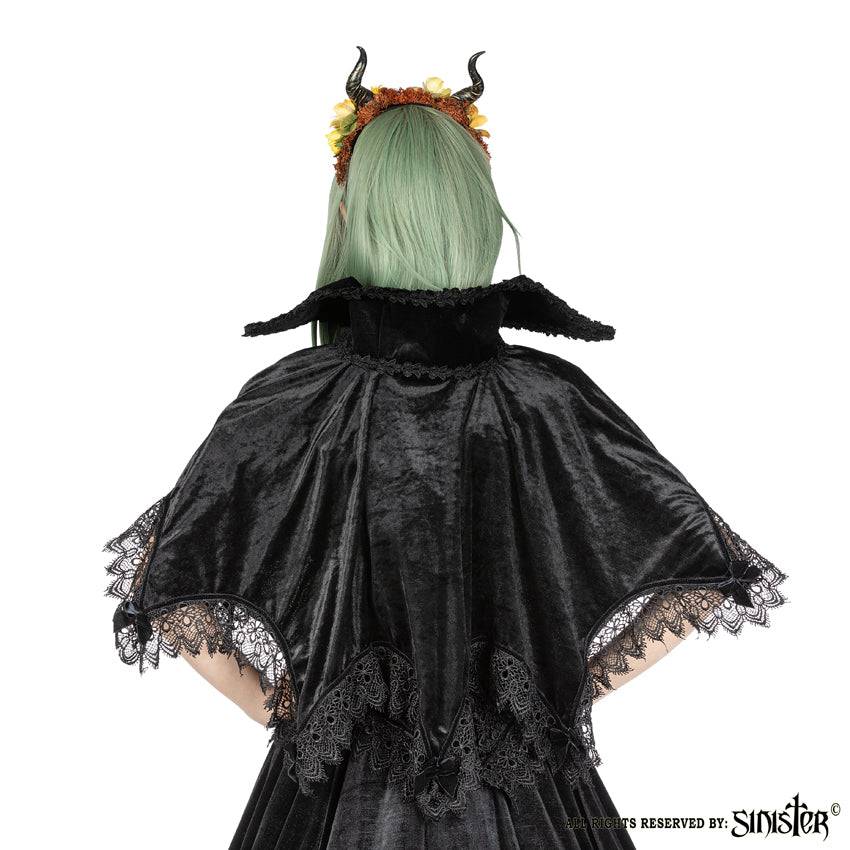 Fluwelen cape met vampierkraag. De cape is afgezet met Venetiaans kant en zwart fluwelen lint en elke punt is versierd met een grote fluwelen strik.